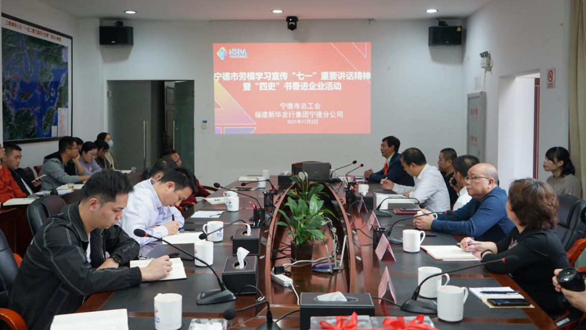 11月2日,市总工会党组成员、三级调研赖文宫同志,劳模代表、2019年福建省五一劳动奖章、古田县委党校高级讲师余红辉同志,福建新华发行集团宁德分公司副总经理缪友文一行到我公司开展劳模学习宣传“七一”重要讲话精神暨“四史”书香进企业活动。公司党委委员、工会主席王怀球主持会议,公司本部及子公司干部职工参加宣讲会。