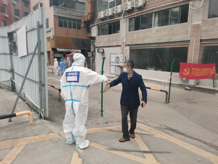 周文雯在核酸检测现场帮居民测体温)