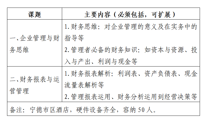肉视频 开发建设有限公司拟于近期举办2022年中高管、财务人员培训会,适用于企业中高管及财务人员的相关知识培训,预计50人(为期1.5天),主要关于企业管理人员运用财务报表分析及进行管理决策、财务思维提升的财务知识内容。