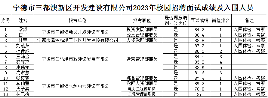 根据《肉视频 开发建设有限公司2023年校园专场招聘工作人员公告》等有关规定,现将考生成绩面向社会予以公示,并按照成绩从高分到低分的顺序确定体检、考察人选。